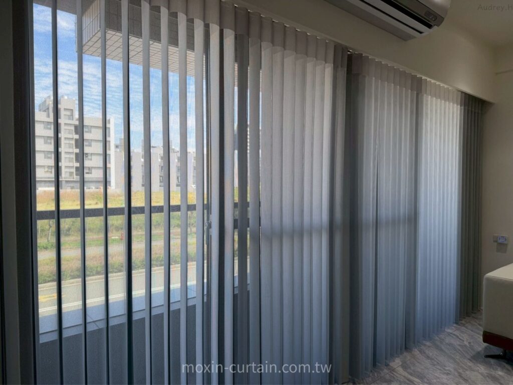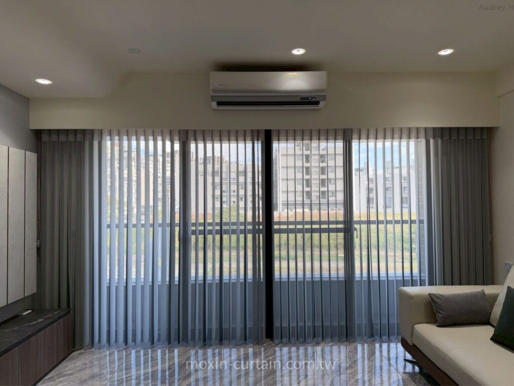 A:不一定,但直立柔紗簾特別適合「景觀陽台+大面窗」的格局。它可以細緻調整片葉角度,白天保留視野與採光,晚上合上又有隱私,且垂直線條能拉高空間比例,和灰白大理石地坪很搭,是本案客廳優先選擇的原因。