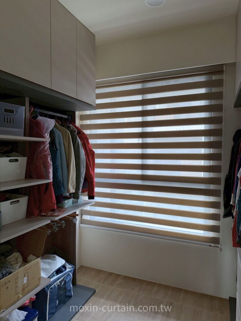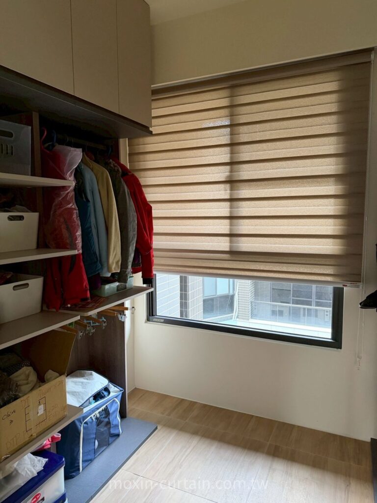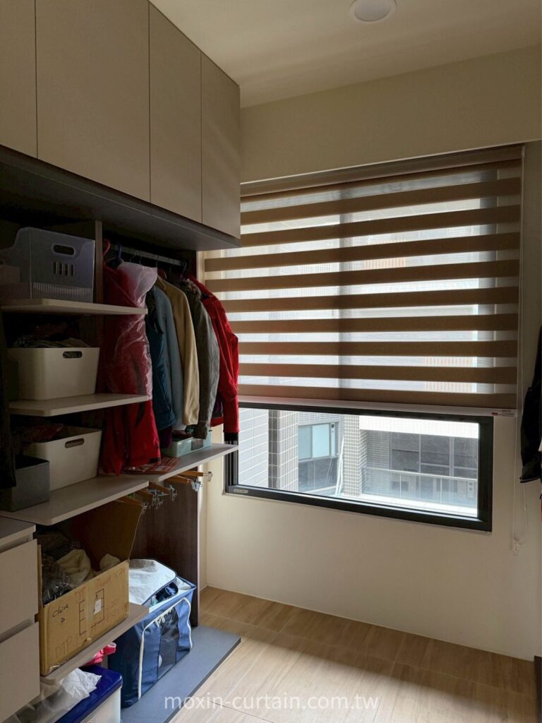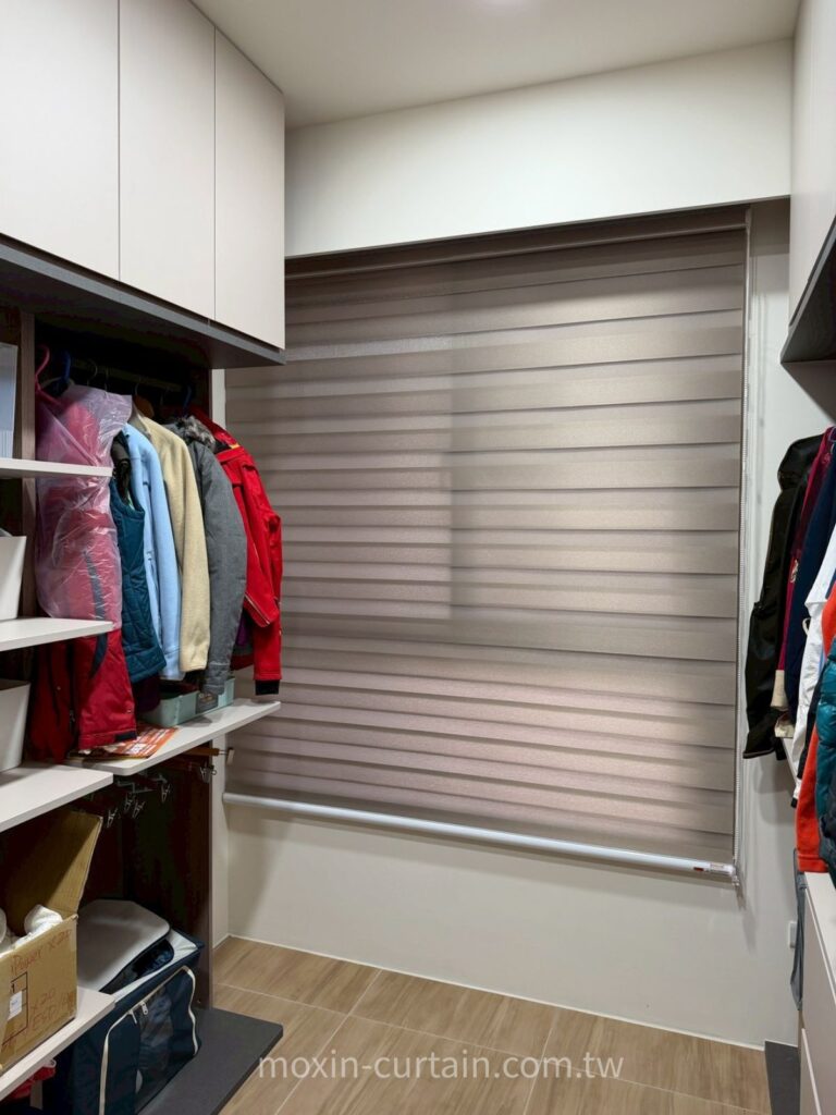 A:會,所以本案更衣室改用透光調光簾,直接安裝在窗框內。這樣不用預留厚布堆疊空間,走道與櫃體深度都能保留,同時又有柔光與隱私效果。對於更衣間、工作陽台這類小空間來說,調光簾與蜂巢簾往往比傳統布簾更實用。