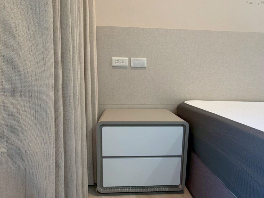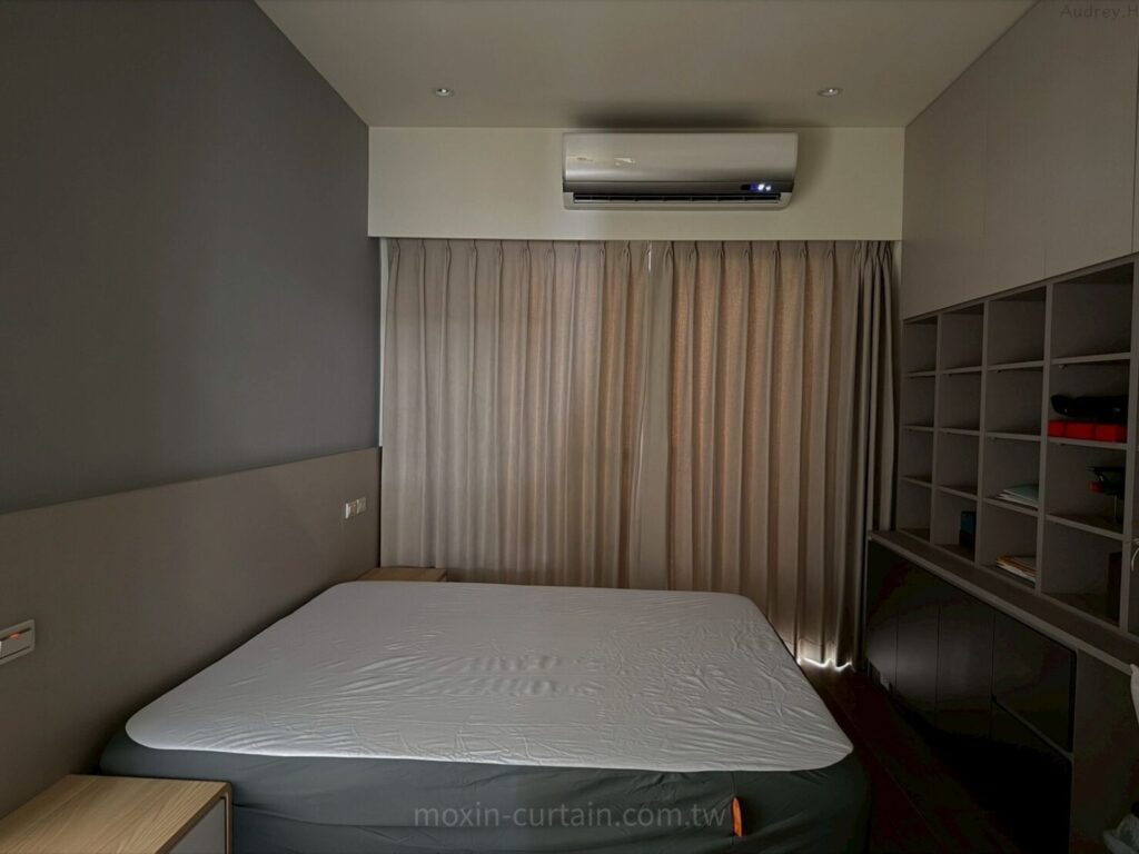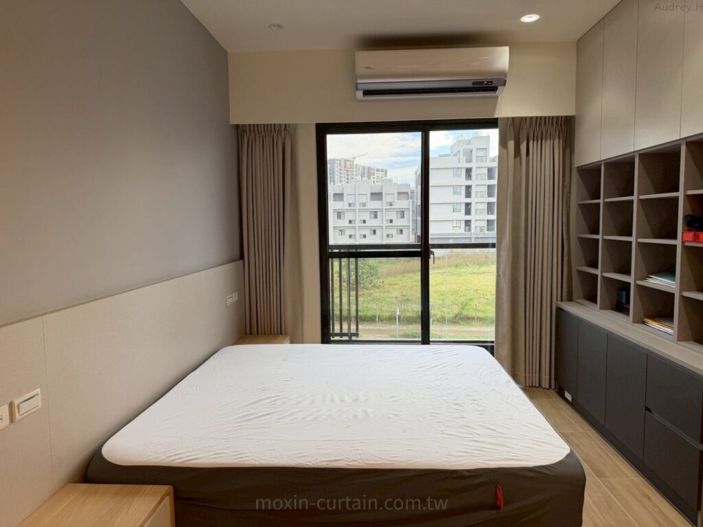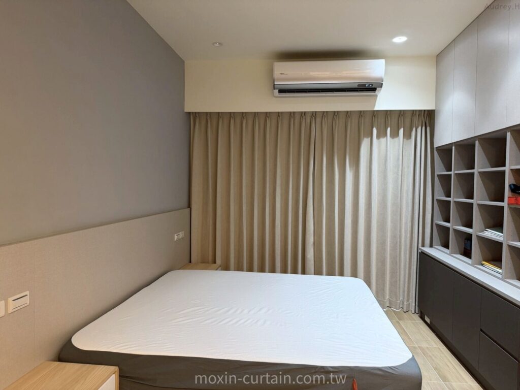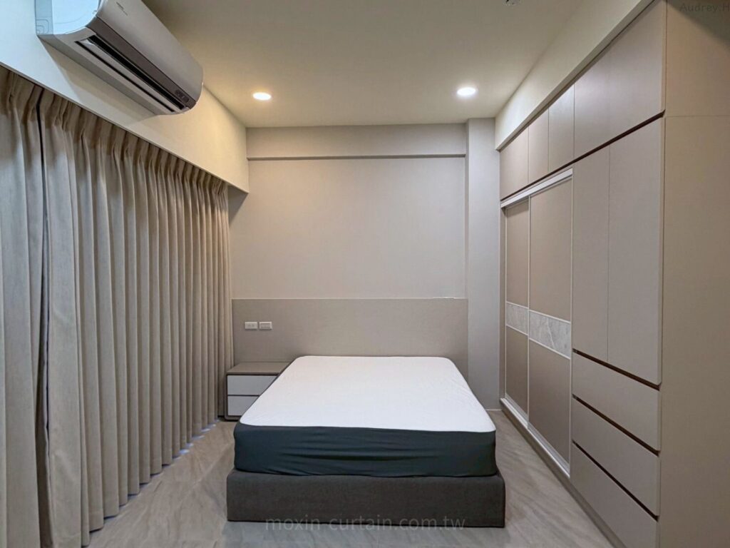 窗簾搭配💡主臥以原色木紋磁磚地板為基底,搭配杏灰色櫃體與床頭背板,整體偏向安穩中性暖色調。為了滿足「遮光+好睡」的主臥需求,我們選用單層米色折景布簾,布面接近杏灰色櫃體,讓床頭到窗邊是一致的暖灰色帶,視覺相當完整。