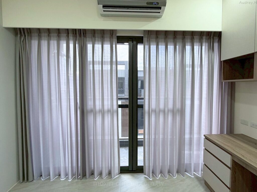 布簾採用折景車縫工法,讓每一摺線條整齊,關起來時布面像一整片柔霧牆面;開啟時則收納在窗側,不干擾景觀窗的視線。