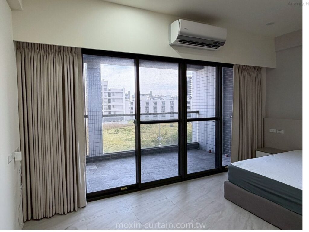 A:因為這間有 11 尺寬的大面窗,若只做到窗框寬度,開窗時兩側布堆會壓在玻璃上,景觀會被遮住。本案改採「滿牆軌道+棉麻折景布簾」,打開時布簾完全收在牆面兩側,窗框幾乎隱形,可以把竹南大埔的戶外景色完整展開,是景觀宅很推薦的作法。