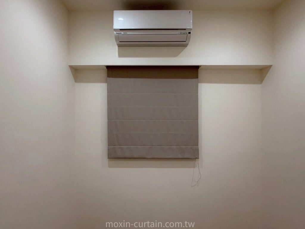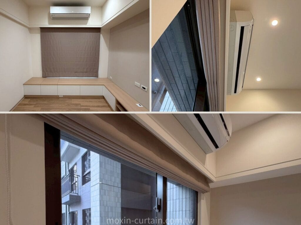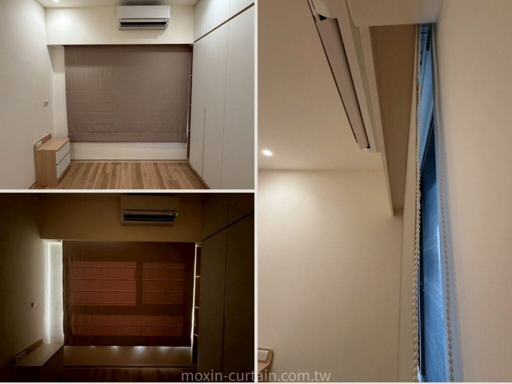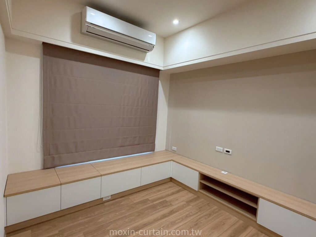 窗簾搭配💡主臥室延續客廳的米咖色調,但更添一份沉穩內斂的氣息。為了配合衣櫃與冷氣位置的空間動線,避免傳統窗簾下垂布料造成的擁擠感,羅馬簾成為不二之選。我們考量到睡眠所需的極高遮光度,特別挑選高密度遮光材質,結合緊密的貼合安裝工法,完美解決窗邊漏光問題,滿足客戶對高品質睡眠的嚴格要求。