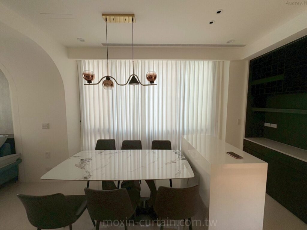 窗簾搭配💡裝潢以灰白黑為基底,搭配大理石紋餐桌與深色櫃體,整體呈現俐落現代感。選用高隱私紗簾,透光不透影,白天引入自然光,同時保有隱私。紗簾細緻織紋,讓光線柔化擴散,營造高級飯店般氛圍;採用隱藏軌道設計,使天花更乾淨俐落。