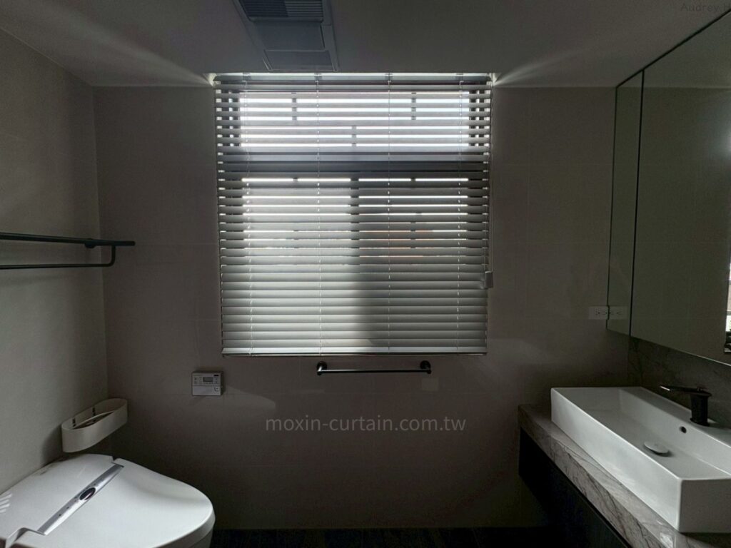 窗簾搭配💡衛浴選用仿木百葉簾,兼顧防潮與清潔便利。