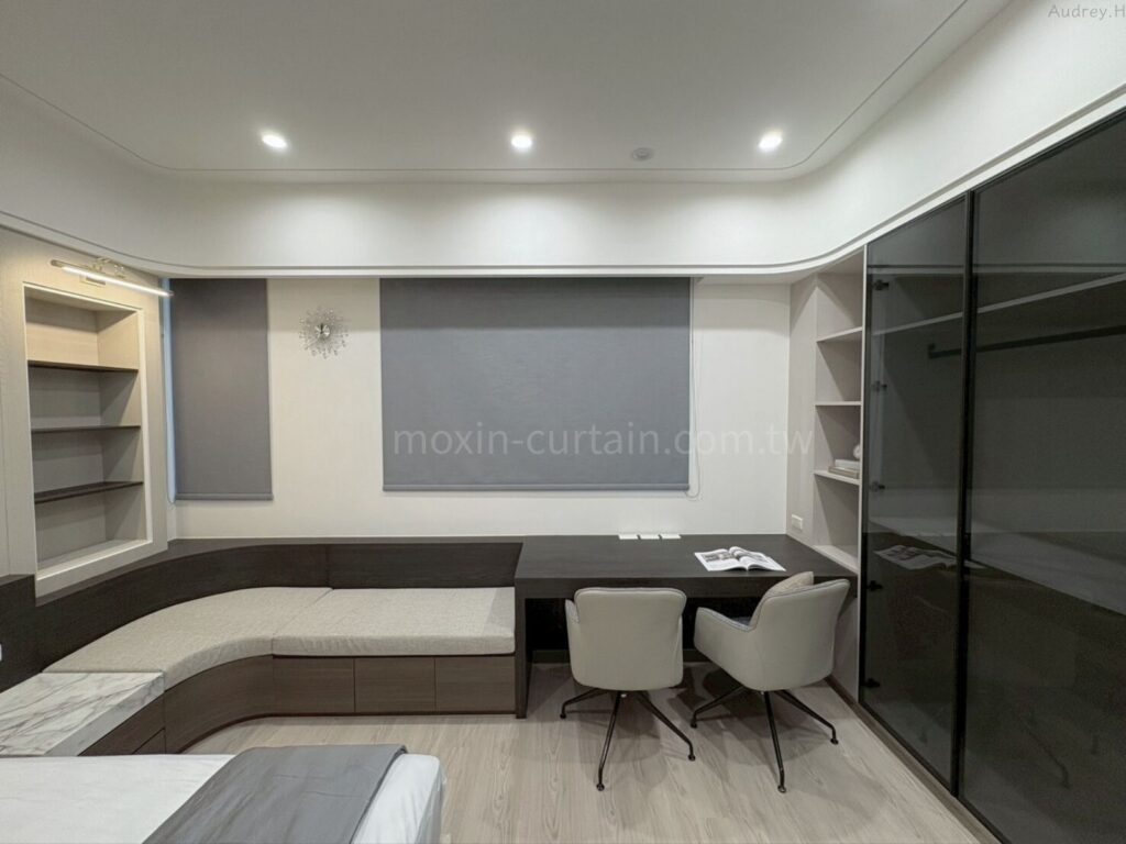 窗簾搭配💡窗緣下方有書桌及臥榻以不影響空間為主,捲簾貼合窗框安裝,節省空間,操作簡單,維持整體俐落感。