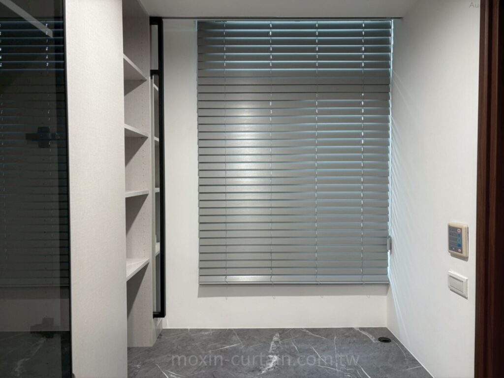 窗簾搭配💡更衣室以灰色調為主,選擇木百葉簾可自由調整光線角度。不需完全開闔,只需調整葉片,即可達到理想光線與隱私。