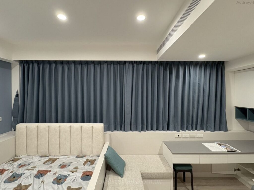 窗簾搭配💡牛仔藍色調展現冷靜與穩重,適合成長空間。