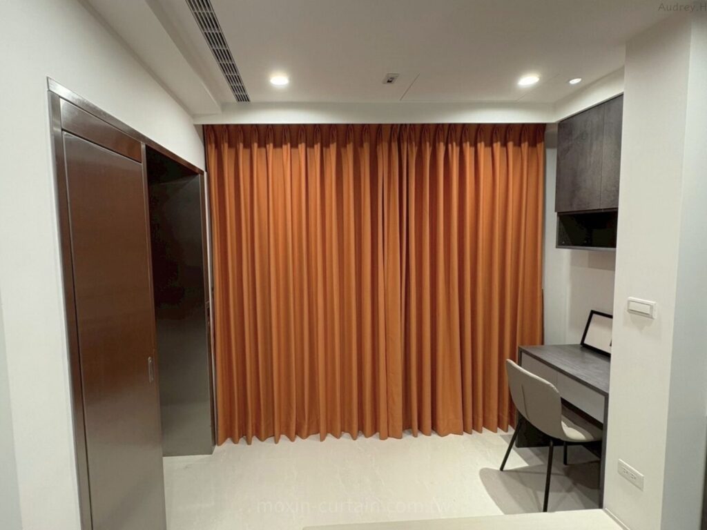 窗簾搭配💡磚橘色提升空間溫度,適合客房或多功能房。