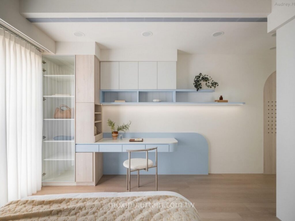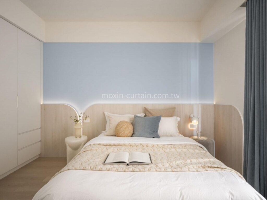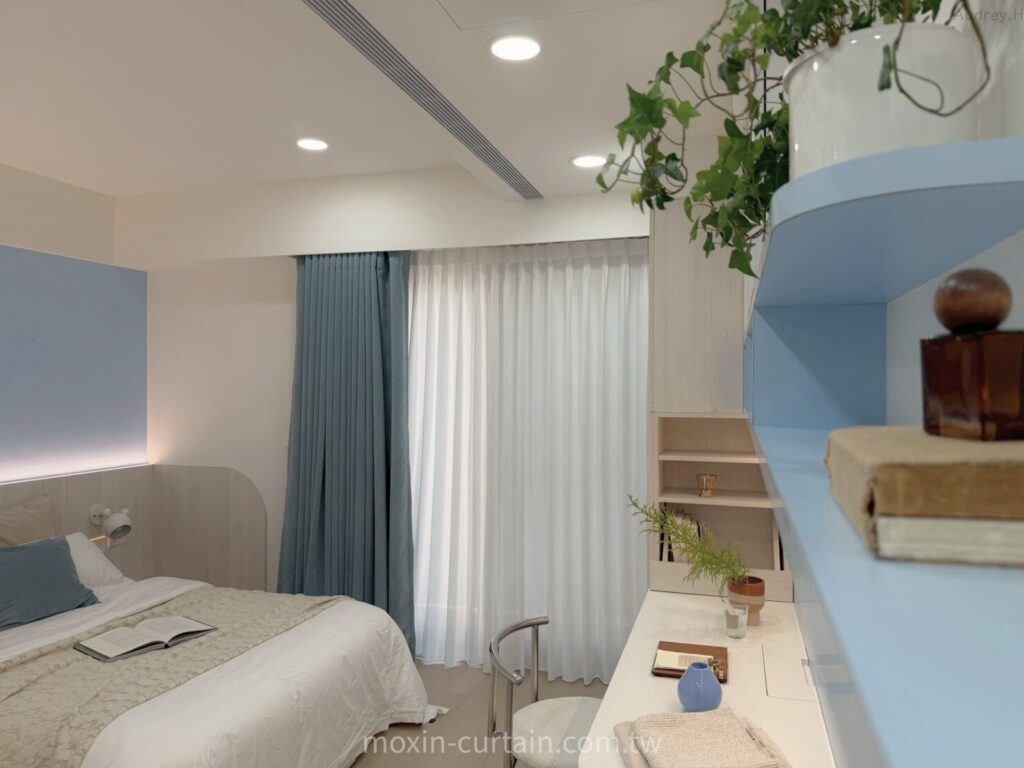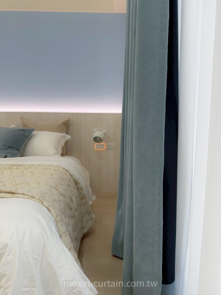 窗簾搭配💡:女兒房以寶寶藍+原木色床頭板與地板做乾淨基底,窗簾用絨面灰藍加深層次,搭配白色折景紗讓白天依然保有通透感。早上需要自然採光但不刺眼,晚上需要穩定遮光睡眠,因此採雙層配置,兼顧「可愛」與「耐看」。