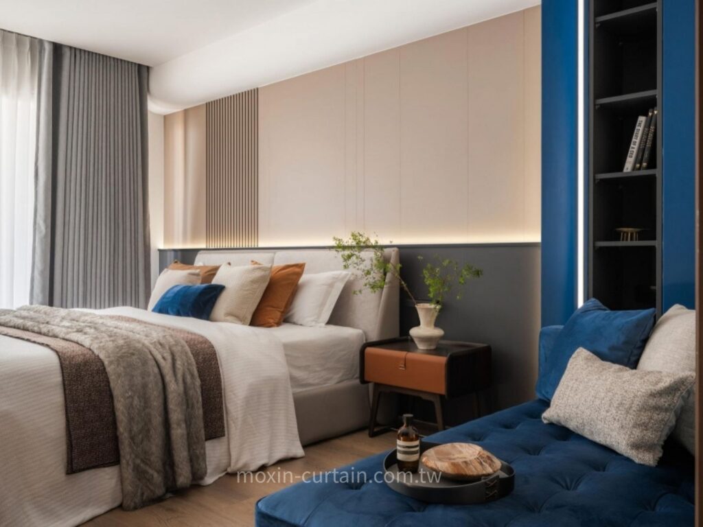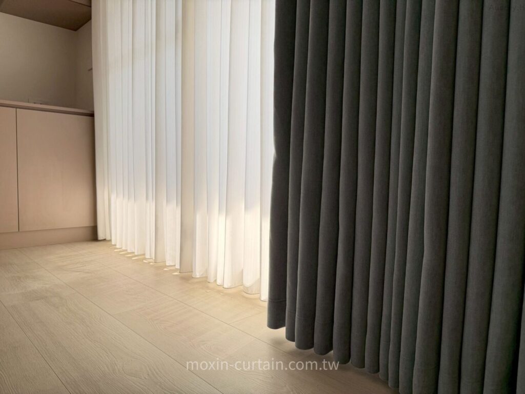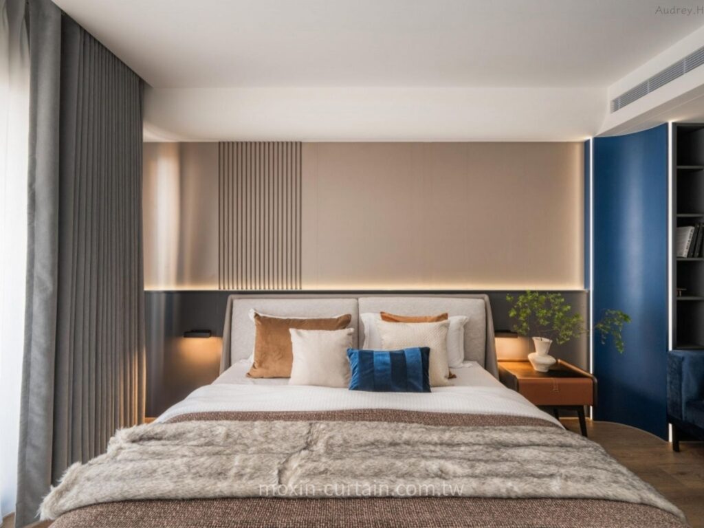 ▍主臥空間|智能電動窗簾(深灰棉絨感蛇型布簾+白色隱私折景紗簾)