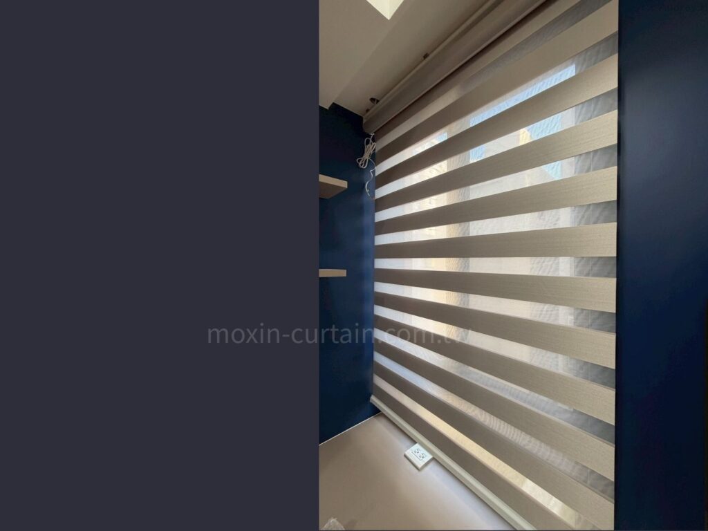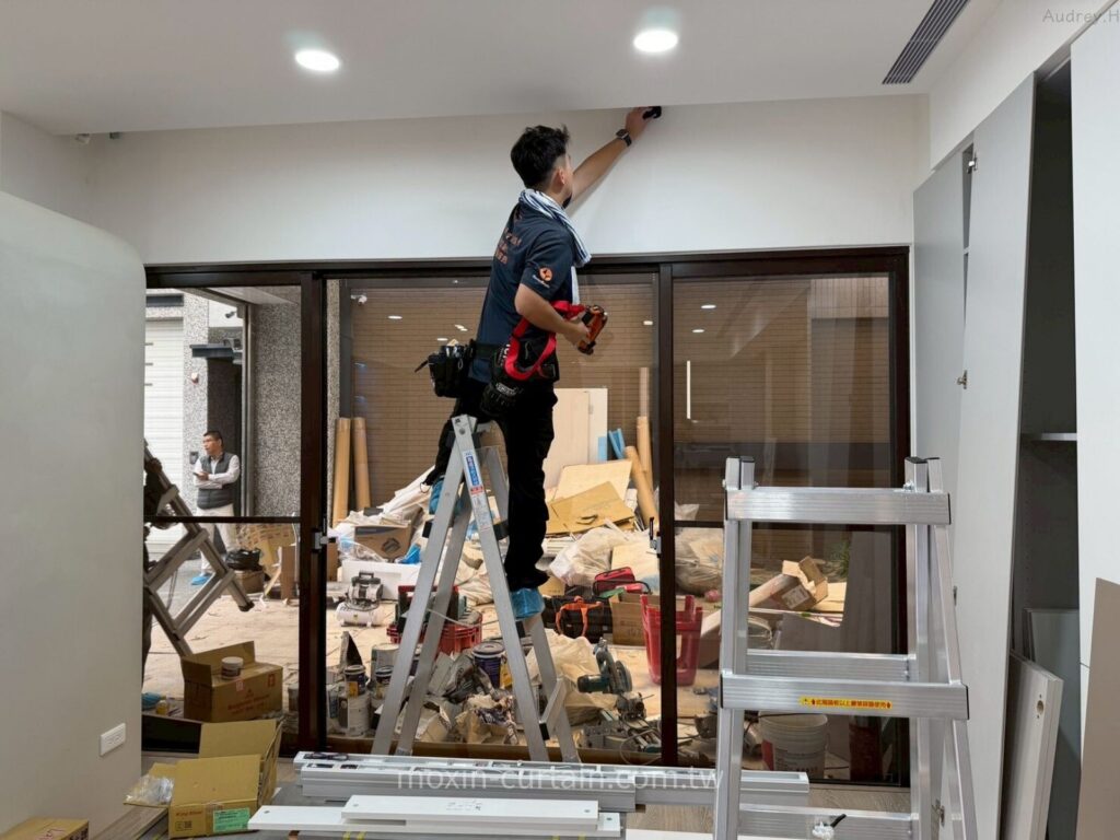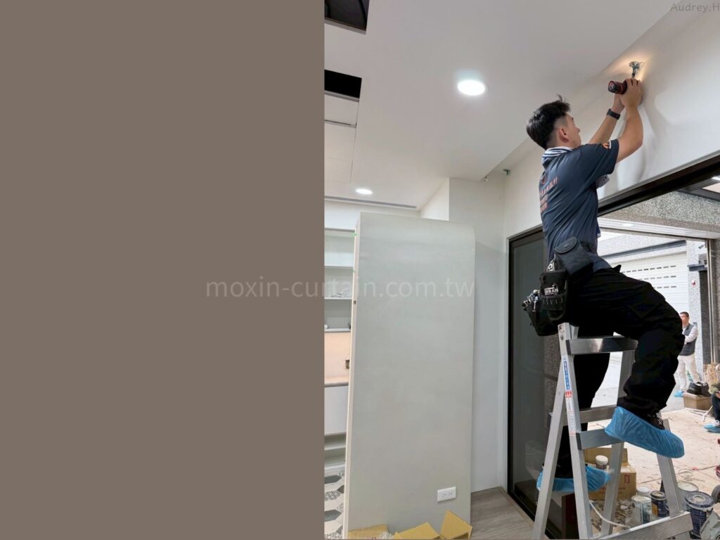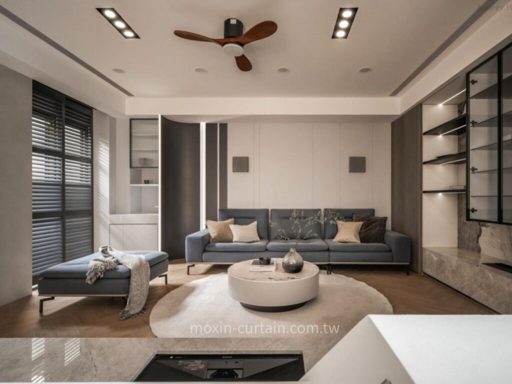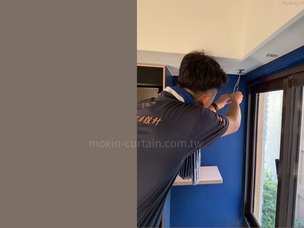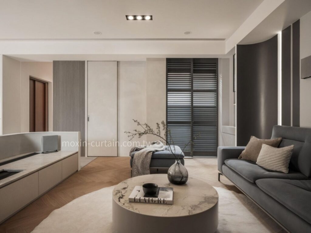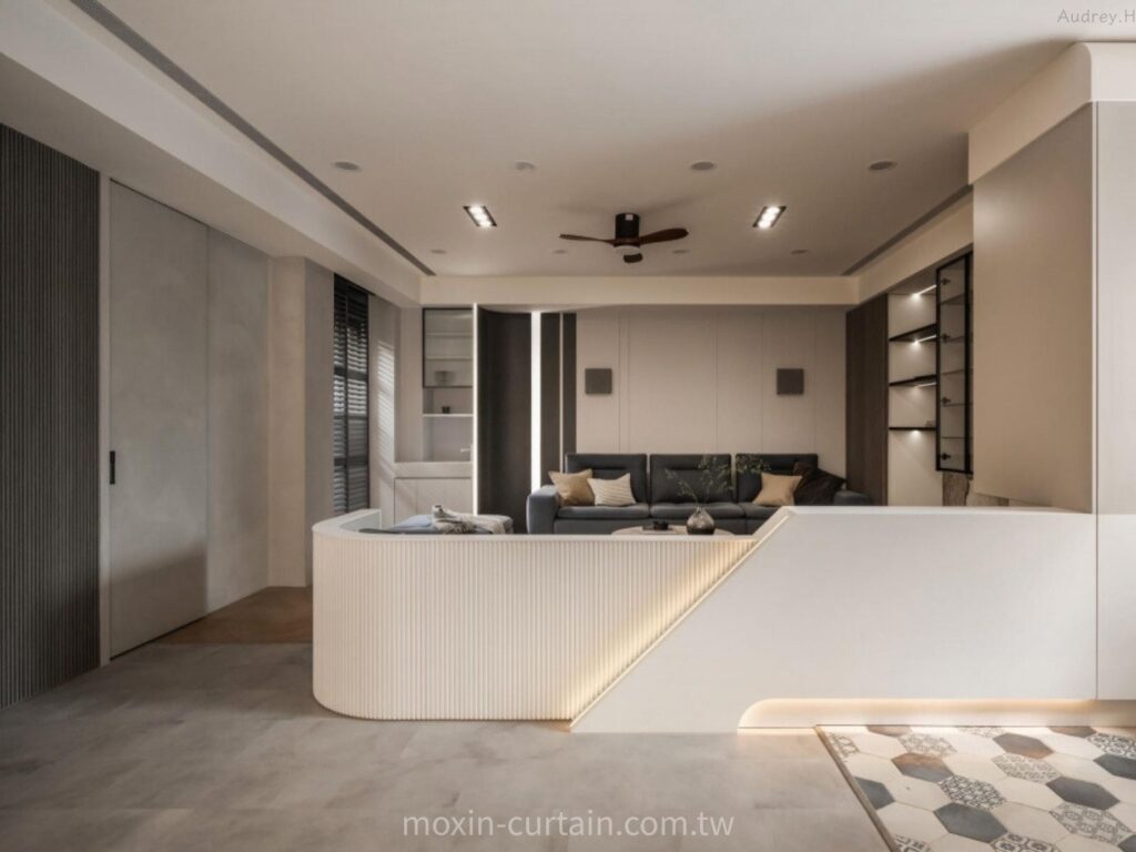 設計靈感來自精品飯店的「光影分層」,白天用柔光、夜晚用氛圍;創新安裝工法以「貼頂隱藏式軌道/五金」縮減視覺量體,讓窗面更乾淨俐落,同時保留最佳遮蔽角度,滿足屋主的時尚與實用需求。