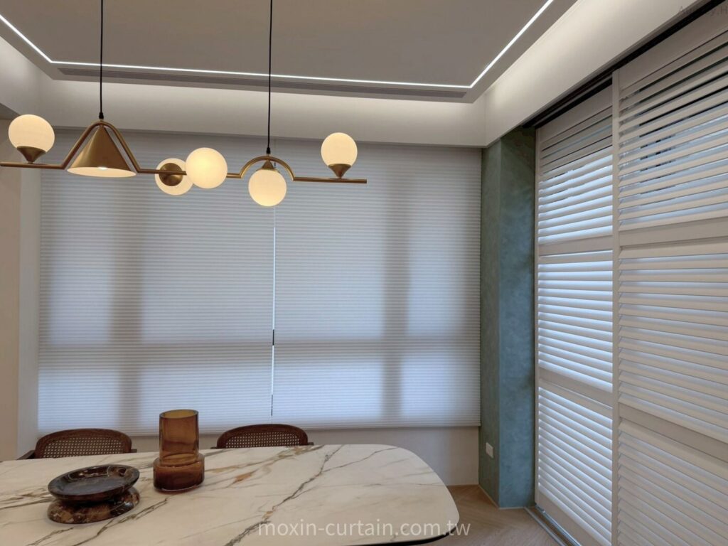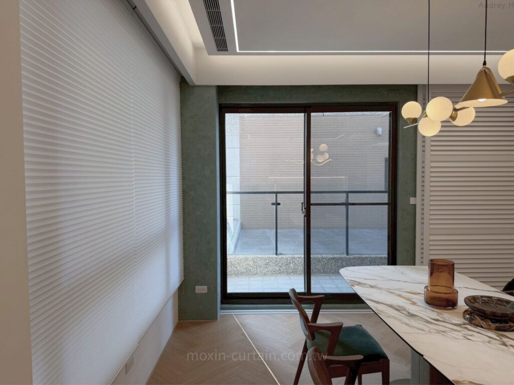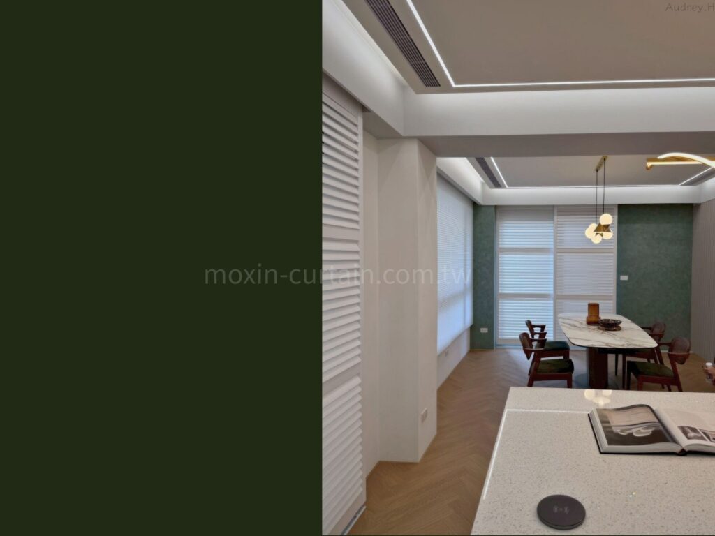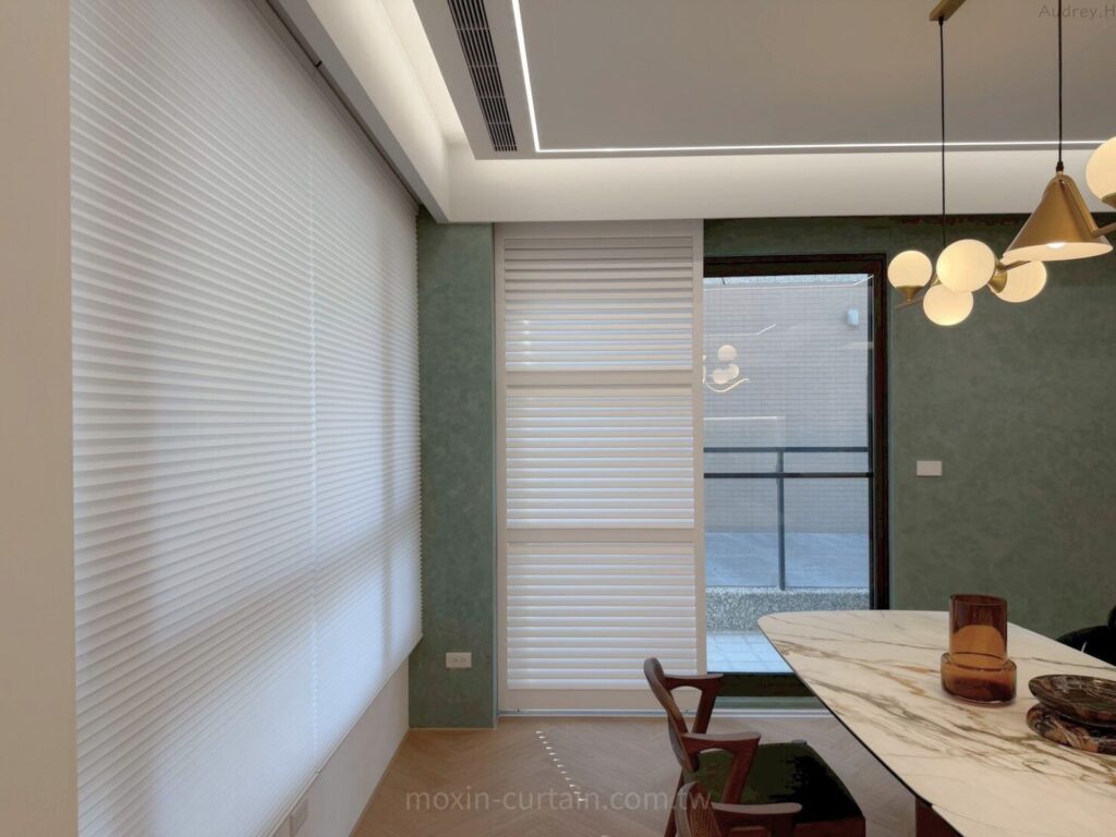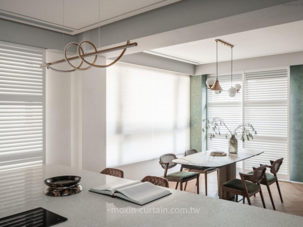 窗簾搭配💡餐廳以綠色特殊漆牆面做出帶南法氣息的清爽底色,搭配深色人字拼木地板提升沉穩質感,再以金屬燈飾收尾。窗面使用「滑門式實木百葉窗」讓角度可調,日間可把光切成漂亮的水平光影;同時加上「智能透光風琴簾」作為第二層,晚餐時段可更柔、更穩定地顧到隱私。