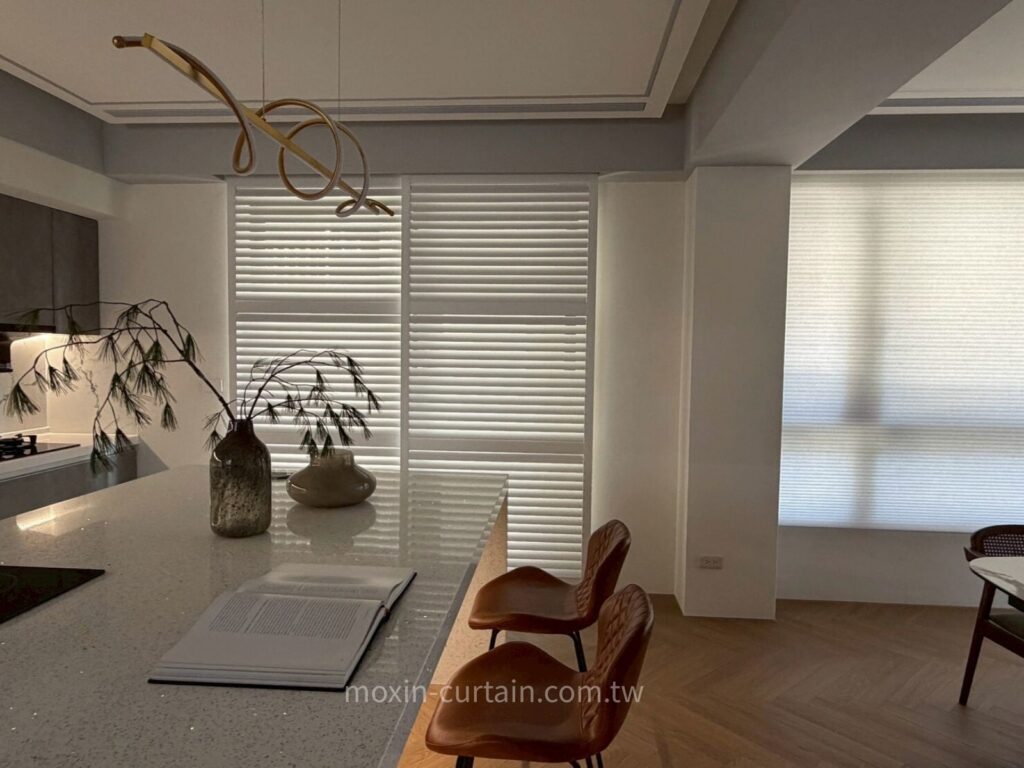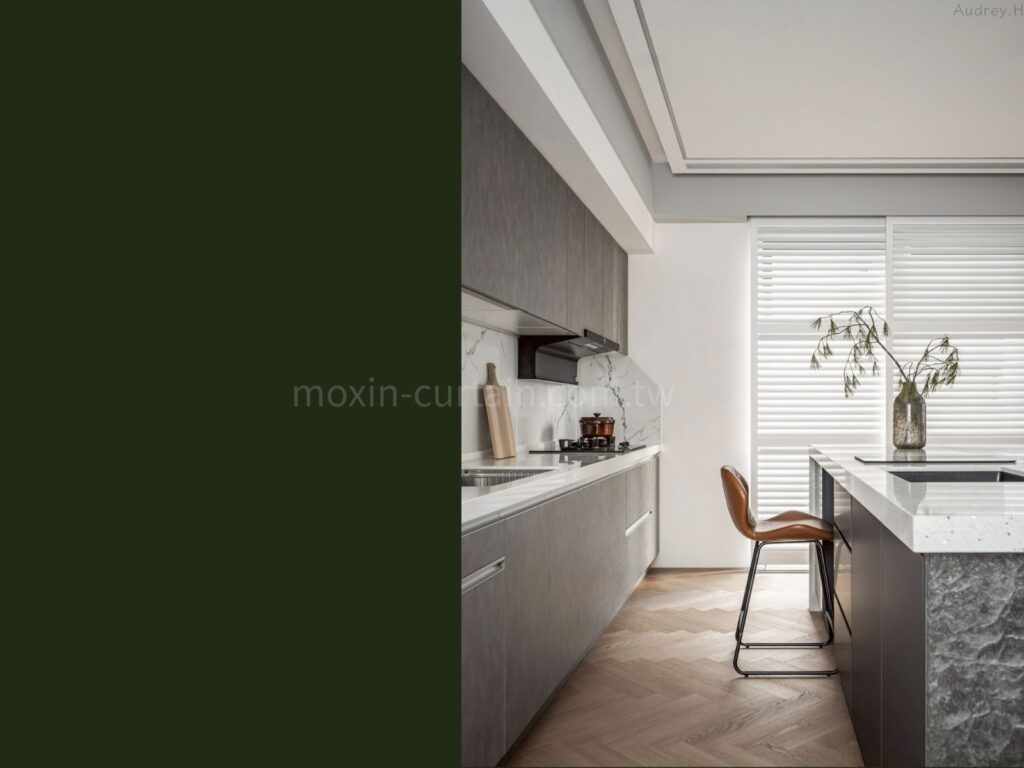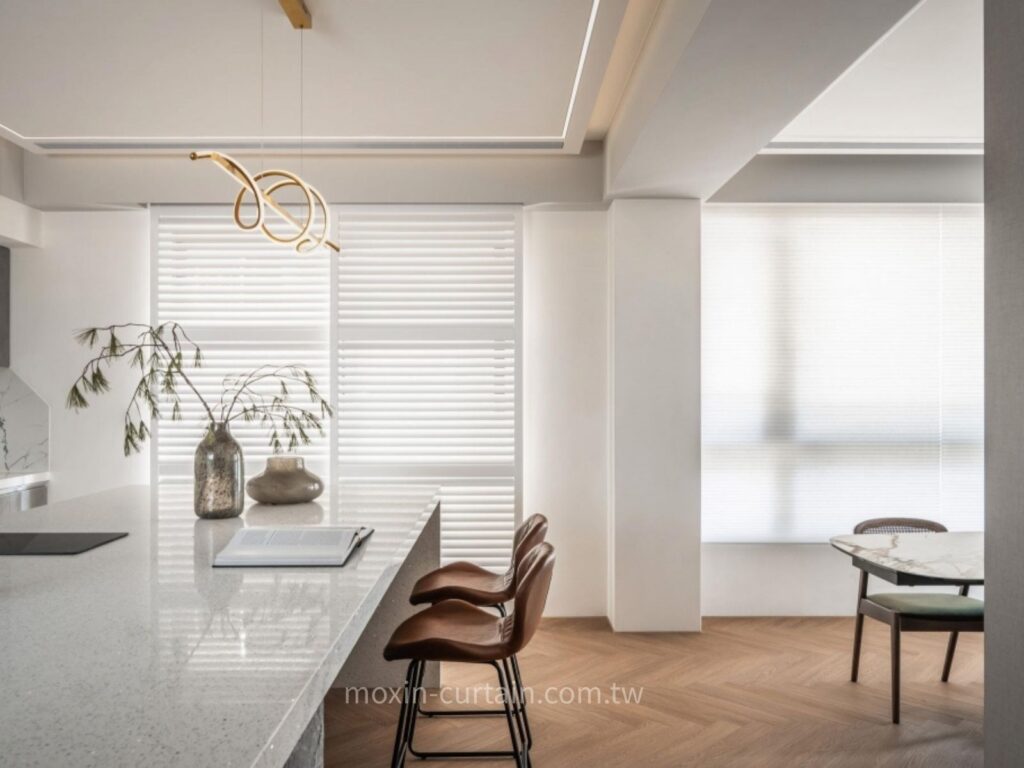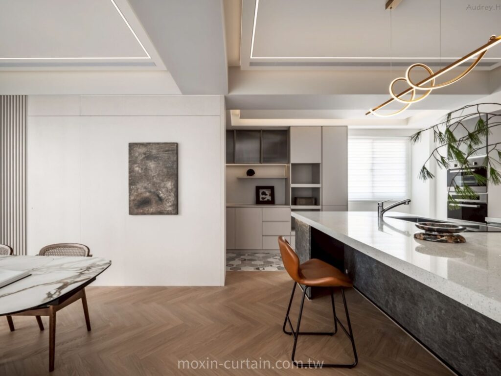 窗簾搭配💡廚房以立體岩石紋櫃體帶出高級石材感,搭配深色人字拼木地板與金屬燈飾,整體更俐落時髦。窗簾選擇「滑門式實木百葉窗」做結構感,再以「智能透光調光簾」快速切換柔光/半遮蔽/隱私模式。