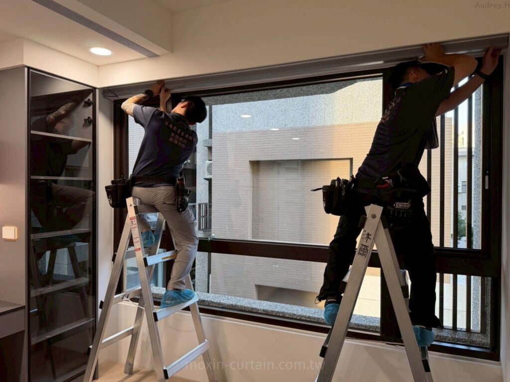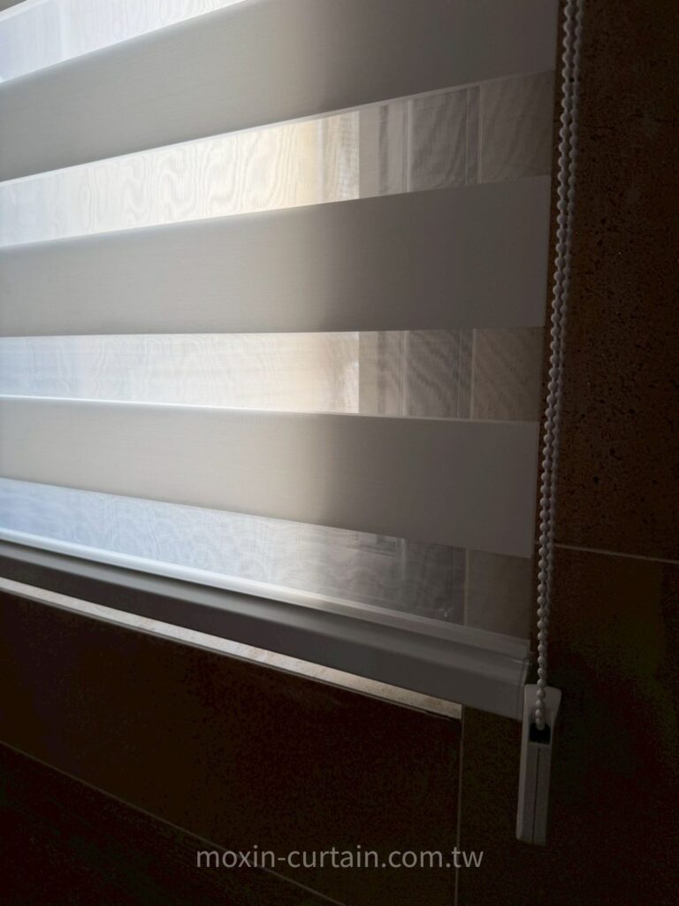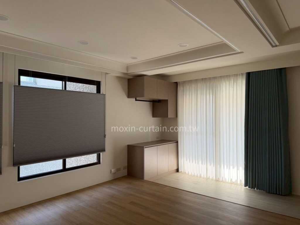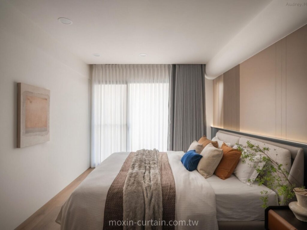 A:以貼頂隱藏式軌道與低彩度配色,反而能讓窗面更立體但不壓迫,白天柔光、夜晚遮光一次到位。