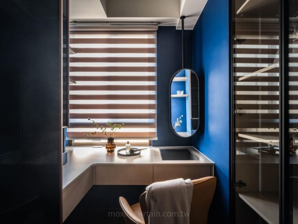 更衣室以深沉藍色牆面搭配黑色鐵件與玫瑰金細節,在光影照射下呈現更成熟的精品感。窗簾選擇「智能遮光調光簾」,讓更衣時的隱私更可控,並以偏暖棕調的布面質地去呼應燈光色溫,讓深色空間不壓迫、反而更有層次。