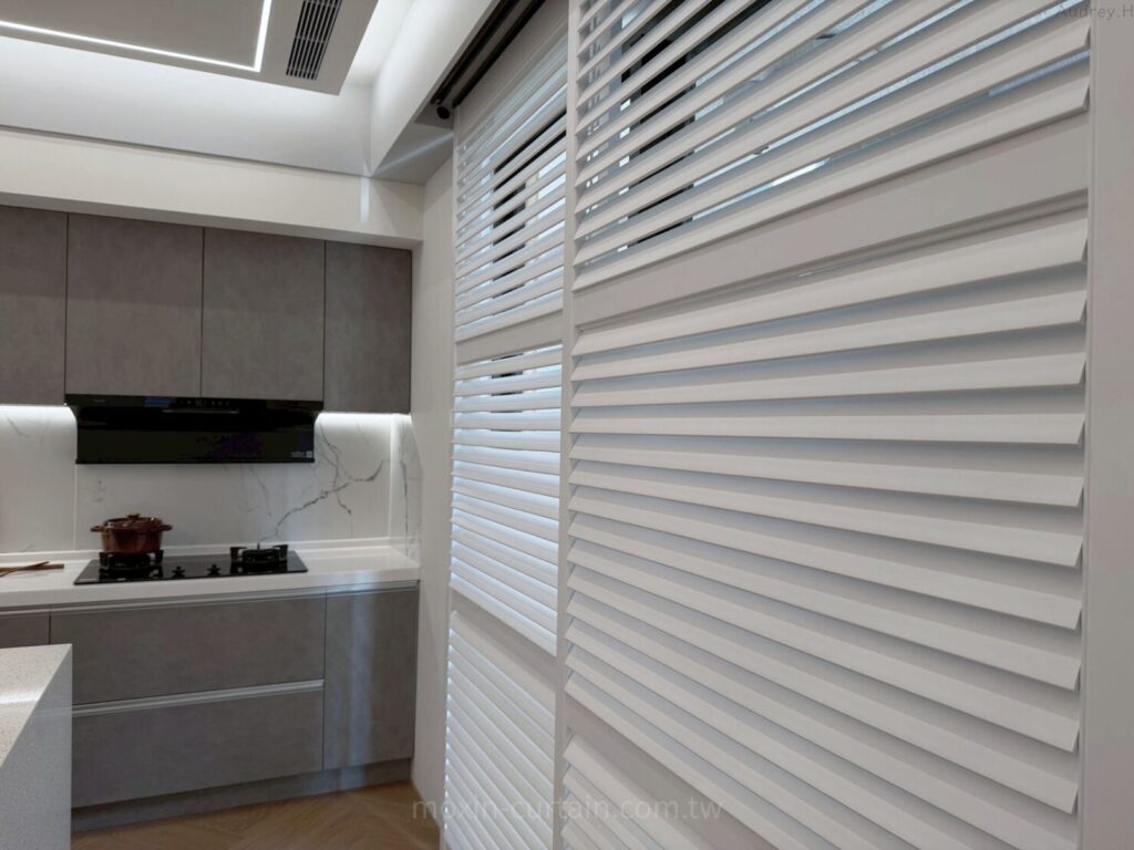 ▍廚房空間|滑門式實木百窗+智能透光調光簾