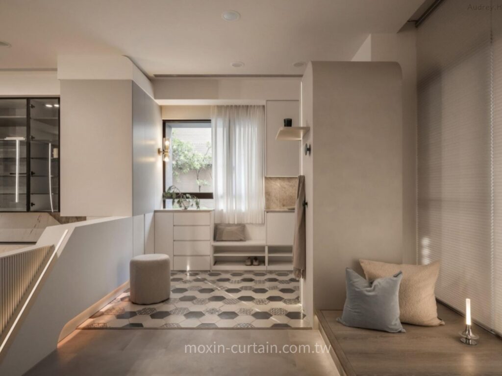 窗簾搭配💡玄關以大落地窗引入明亮採光,搭配棕色木紋臥榻與收納鞋櫃,材質走溫潤路線。窗簾採電動智能風琴簾,蜂巢結構能提升隔熱,並把玄關容易被直視的視線做柔性遮蔽。鞋櫃上方再以輕柔白色紗簾增添過渡層,讓進門第一眼更乾淨、有儀式感。