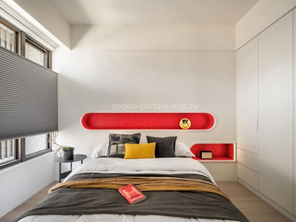 兒子房以灰黑白櫃體建立未來感秩序,並用紅色在床頭櫃體內里與書架做跳色亮點。窗簾選擇同色系的灰色遮光風琴簾,讓視覺維持乾淨一致,也利用蜂巢結構強化隔熱與遮光,維持更好的房間舒適度。